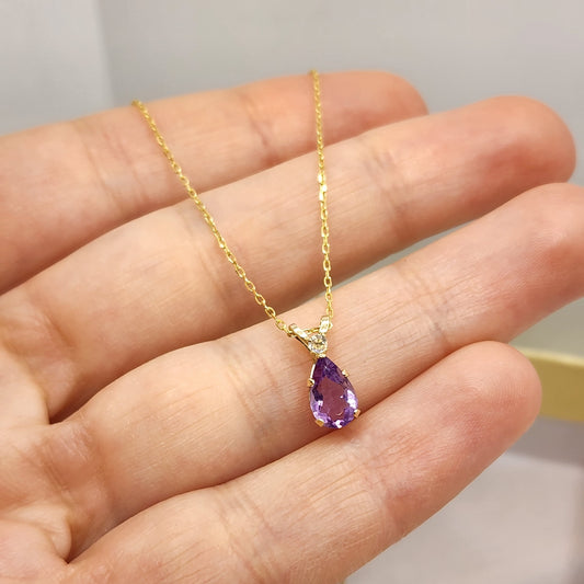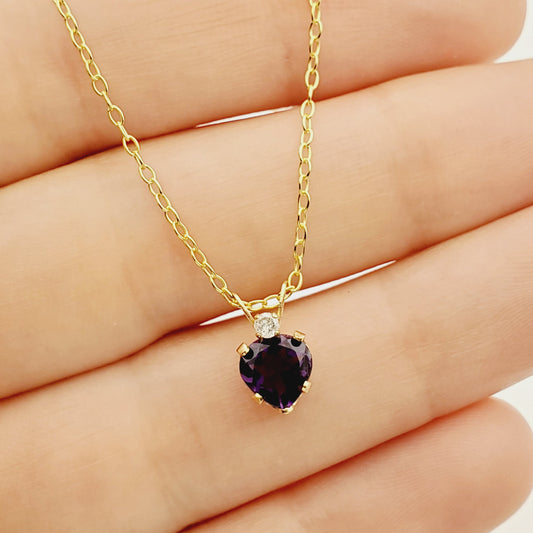 10K Yellow Gold PendantGenuine Amethyst 6x4mmWith three diamondsPendant height: 0.54"Handcrafted with care in CanadaChain Options:- Gold plated sterling silver chain 16", 18"- 10KT Yellow Gold 16",18", 20"- 14KT Yellow Gold 16",18", 20"- Thickness is 1-1.2 mm- Weight is 1-2.5 gramsComes in a beautiful gift box | Perfect for giftingAmethyst is...
