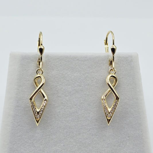 Stylish 10K yellow gold dangle earrings featuring a modern twisted design accented with sparkling cubic zirconia stones. With a secure leverback closure, they offer comfort and everyday elegance, making them a perfect gift or a timeless addition to your jewelry collection. Ideal as bridal earrings, wedding jewelry, or a meaningful...