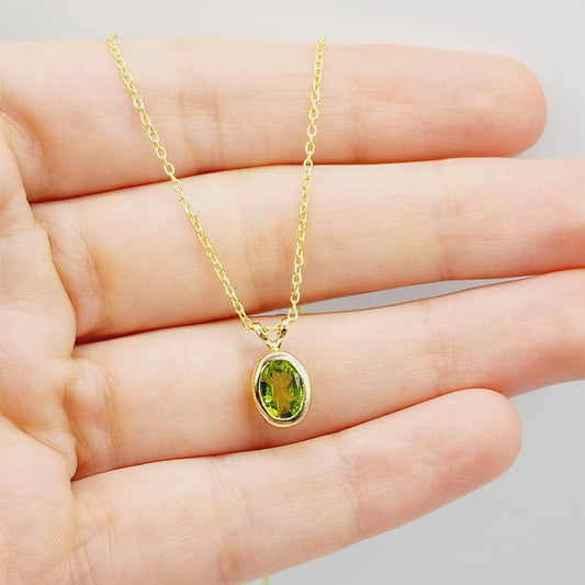 Elevate your style with our exquisite Gold Peridot Pendant Necklace. Crafted from 14K Yellow Gold, this captivating piece showcases a genuine 8x6mm oval Peridot gemstone in a sleek bezel setting. The radiant green hue of the Peridot, known as the August birthstone, adds a touch of elegance and symbolism to...