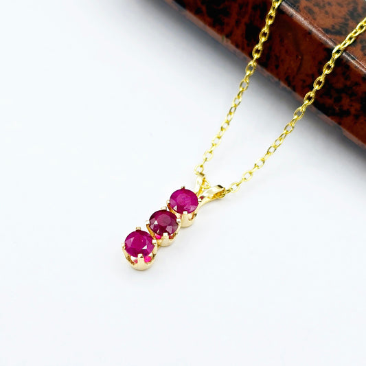 14K Yellow Gold PendantWith 3 Genuine Ruby 0.72ctsSize of each stone: 4x4mmPendant Height: 0.62" (16mm)Handcrafted with care in CanadaThe rubies used in this product are naturally enhanced.This pendant is available in different gemstones.Chain Options:- Gold plated sterling silver chain 16", 18"- 10KT Yellow Gold 16",18", 20"- 14KT Yellow Gold 16",18",...