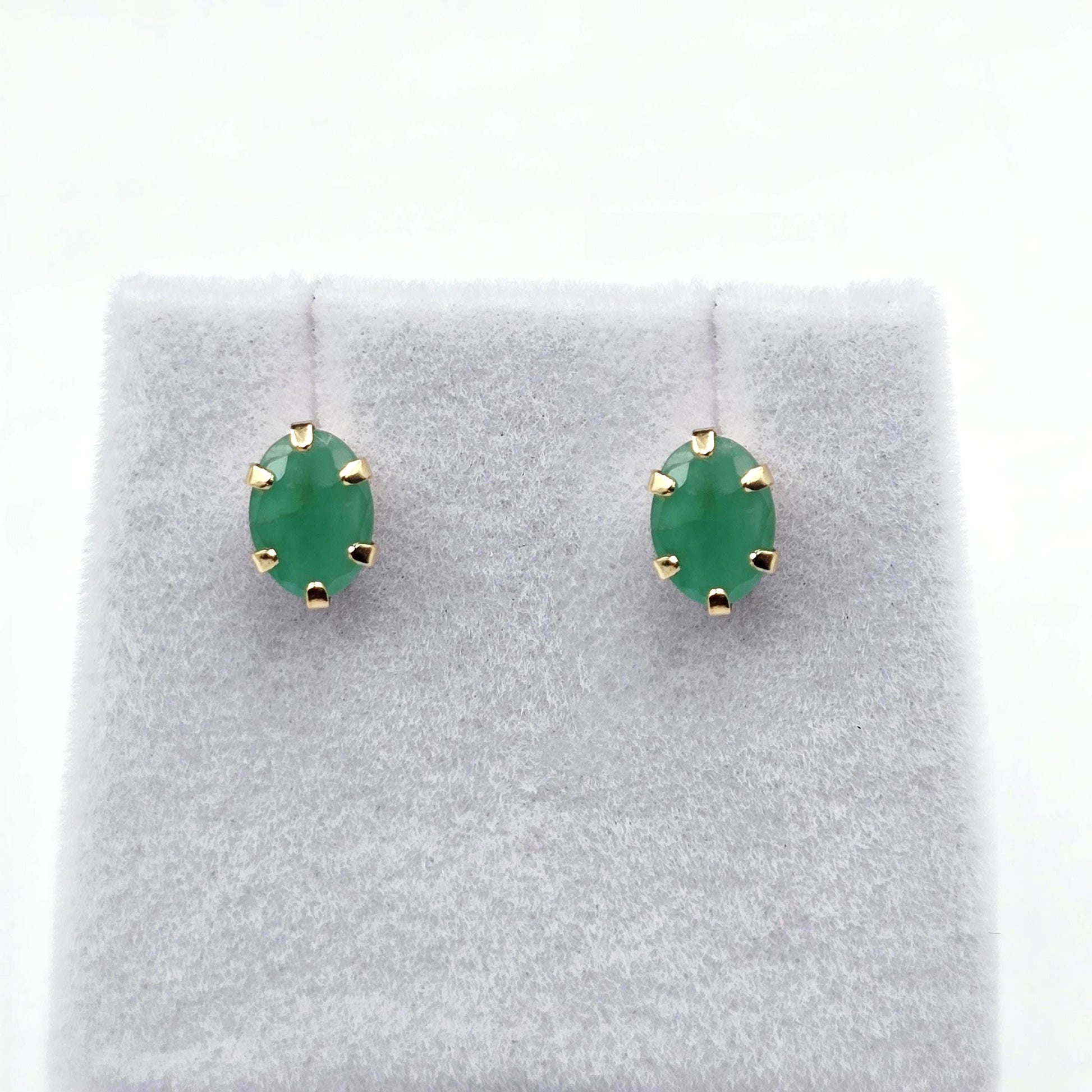 10K Yellow Gold Genuine Emerald (1.6 carats total) Size of each stone: 7x5mm Handcrafted with care in Canada Comes with 10K gold silicon clutches for cushioned comfort and loss prevention and in a beautiful gift box - Perfect for gifting