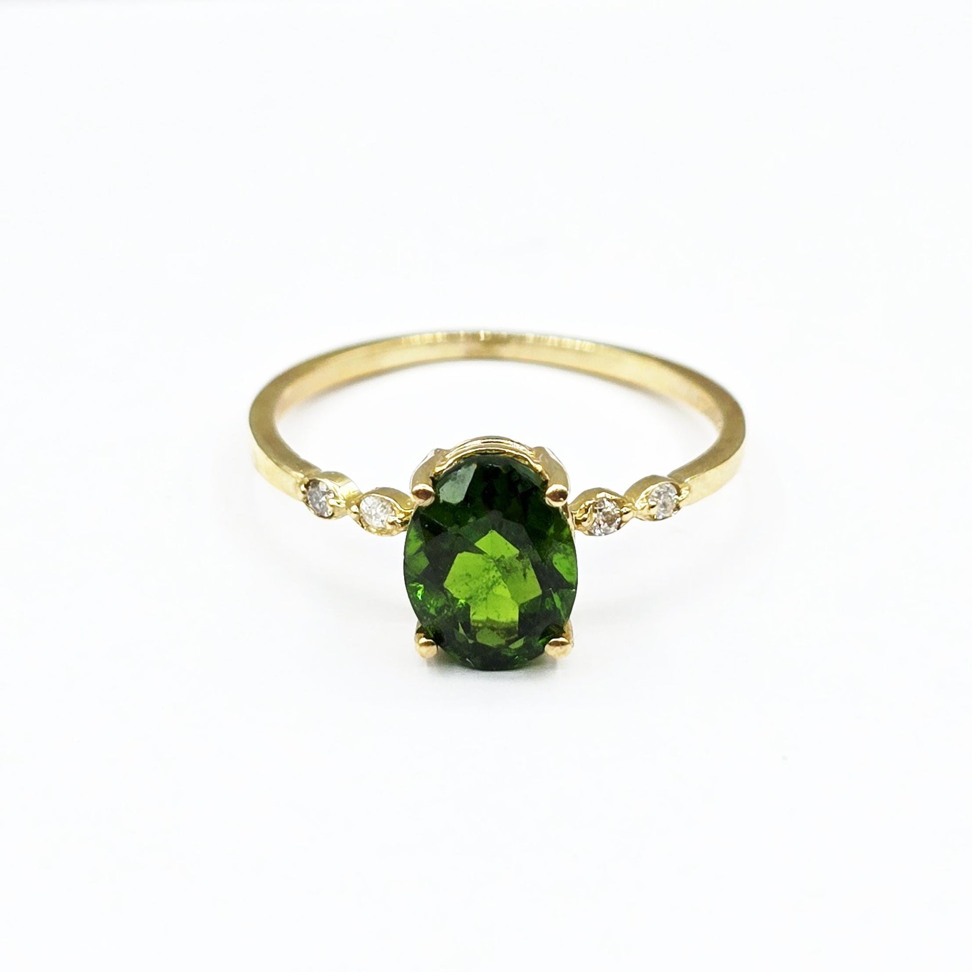 This stunning handmade 10K yellow gold ring features a genuine 8x6mm oval green tourmaline, accented by sparkling diamonds. A perfect choice as a meaningful promise ring, elegant birthstone gift, or minimalist statement piece for her everyday style.