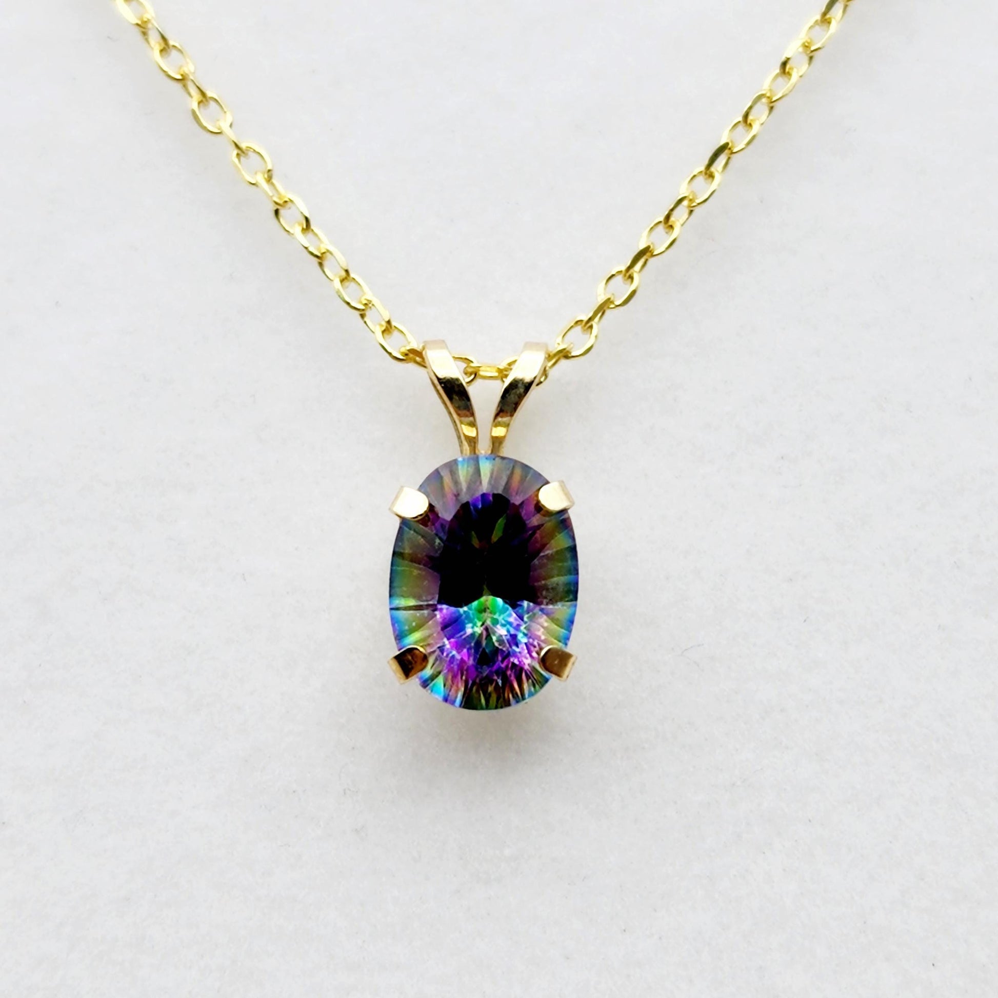 Elevate your style with our Gold Mystic Topaz Pendant Necklace. Crafted from 10K yellow gold, this exquisite necklace features an 8x6mm genuine mystic topaz gemstone. The captivating play of vibrant colors adds a touch of elegance and mystique. Perfect for any occasion, this pendant necklace is a must-have accessory for her collection.
