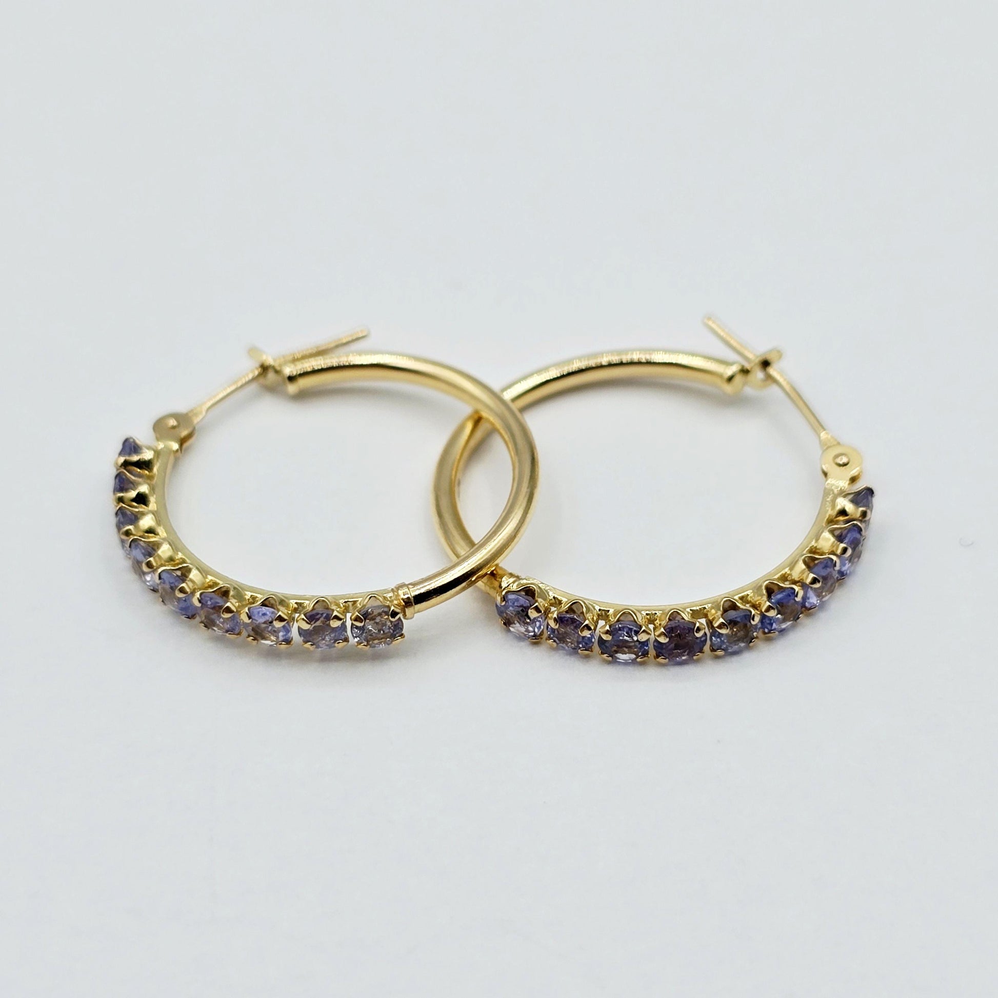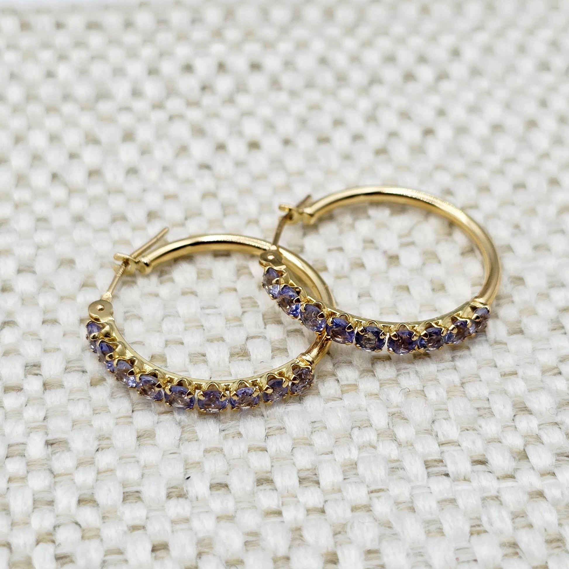 Elegant and timeless, these 10K yellow gold hoop earrings are adorned with 18 sparkling 2.5mm genuine tanzanite stones. Each stone radiates a soft violet-blue hue, adding a touch of sophistication and color to your everyday or evening look. Crafted in solid gold, these hoops are both luxurious and durable perfect for gifting or treating yourself.