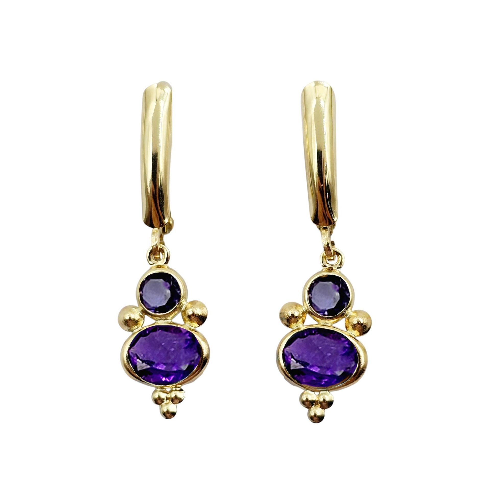 14K Yellow Gold Earrings Genuine Amethyst 1.75ct, 7x5mm and Iolite 0.45ct, 3x3mm Closure: Lever back Earrings height: 1.18 inches (30mm) Earrings Width: 0.30 inches (8mm) Handcrafted with care in Canada This item is available in several gemstone selections. Please message me if you need any further information. Comes in a Beautiful Gift Box, Perfect for Gifting ------------------------------------------------