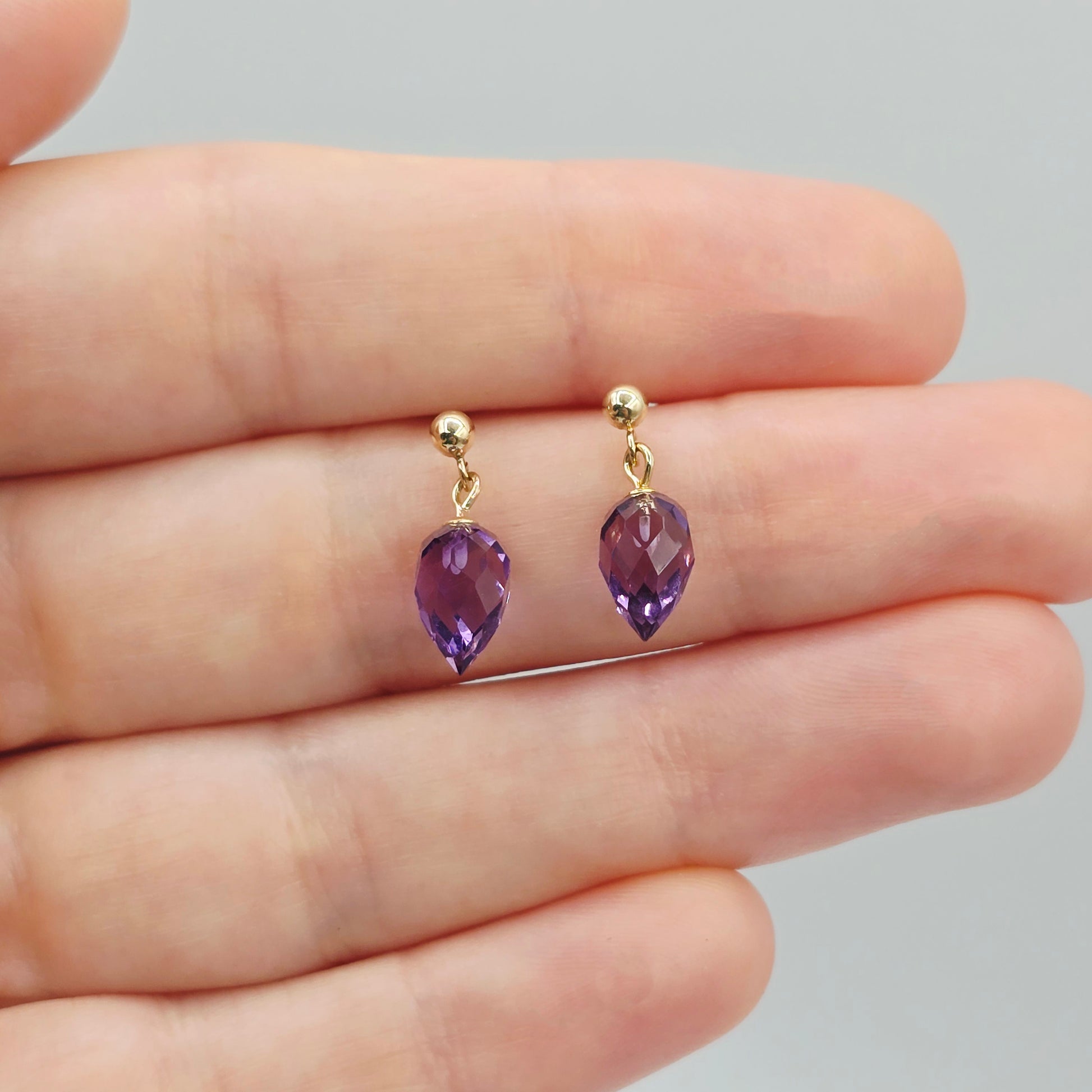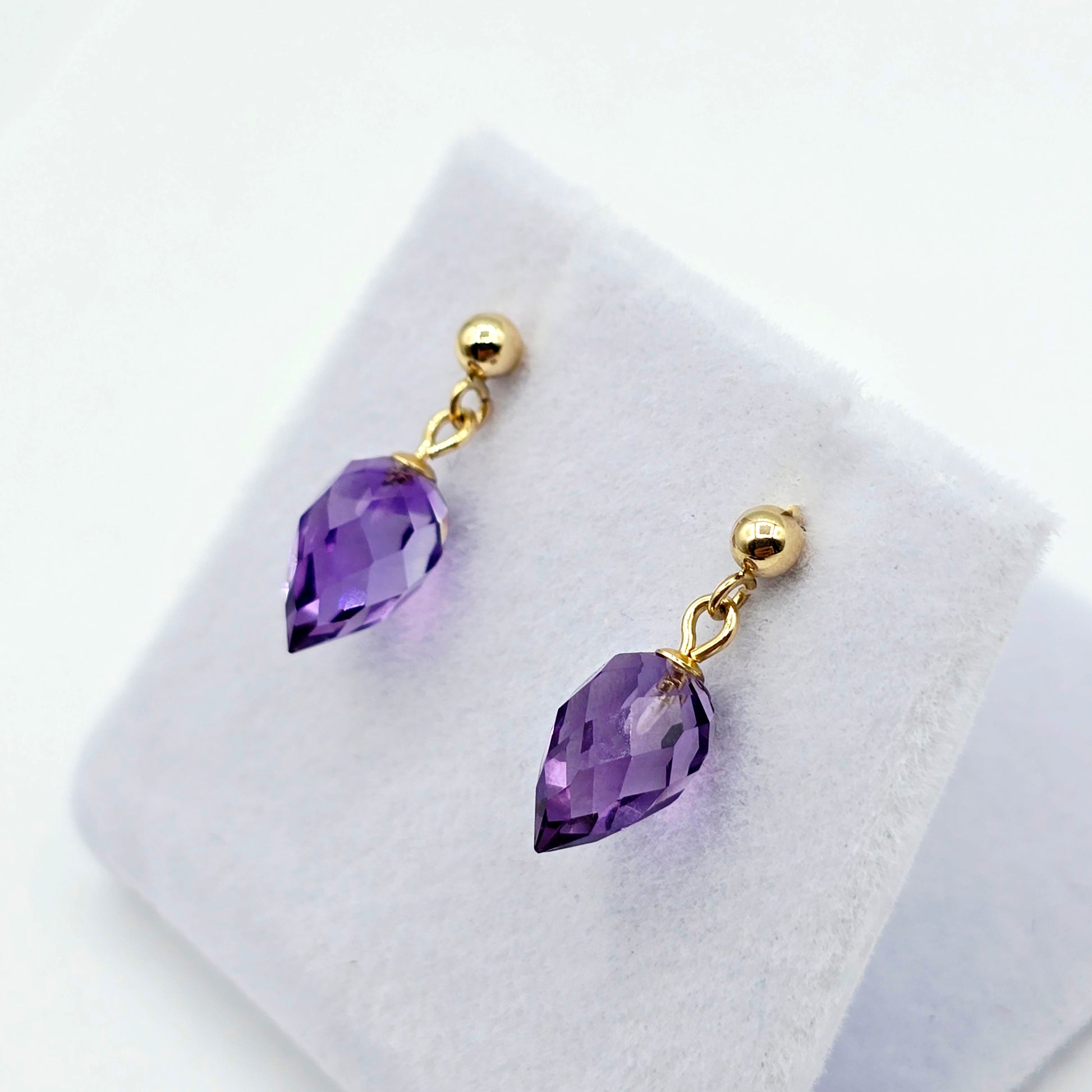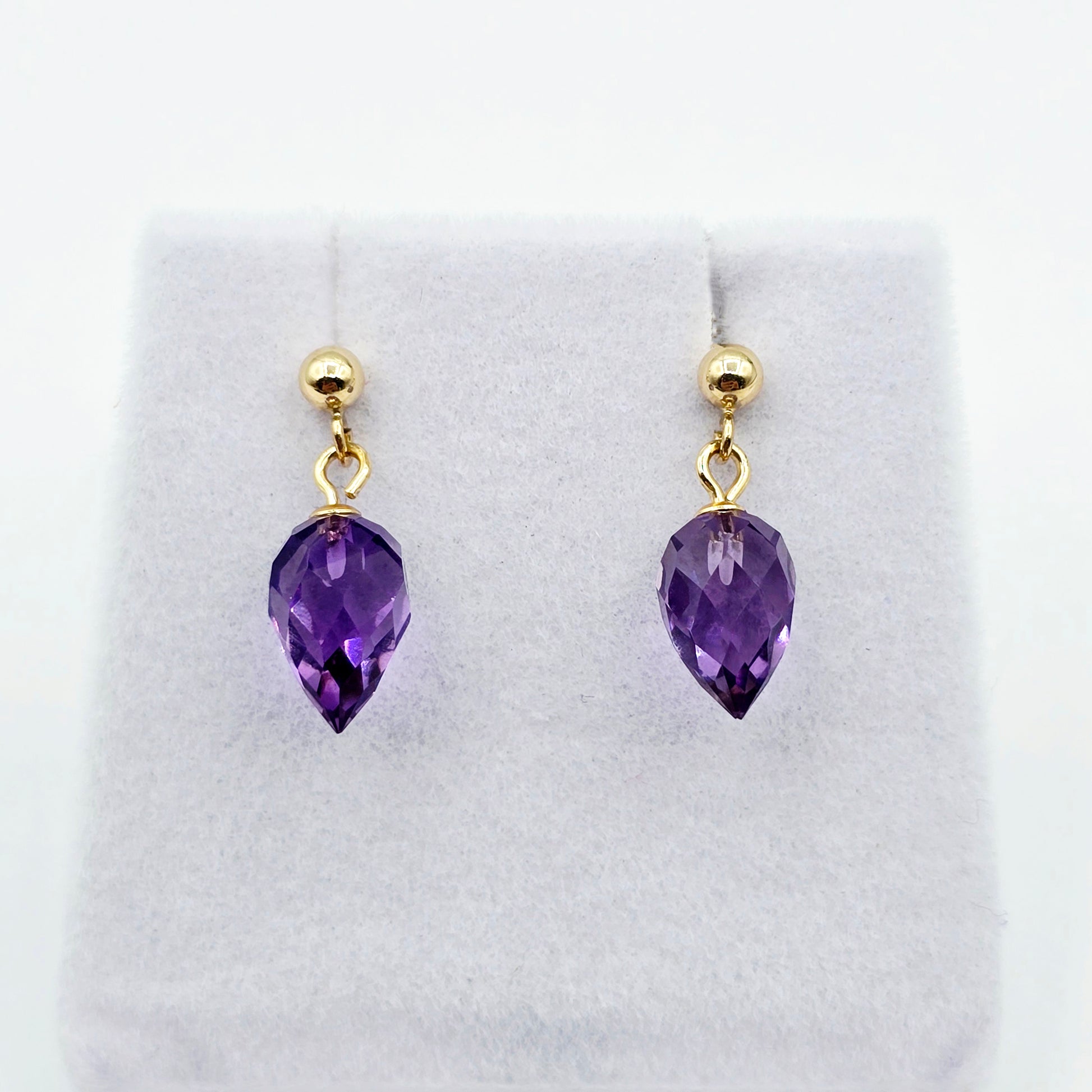 Elegant and timeless, these stunning earrings feature natural pear-shaped amethyst gemstones in a dazzling briolette cut, suspended from classic 14K yellow gold ball studs. The deep purple hue of the amethyst adds a rich pop of colour, while the faceted surface catches the light beautifully with every movement.