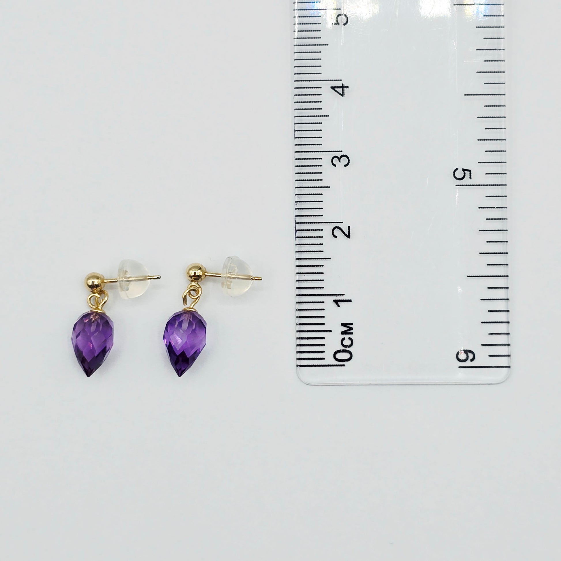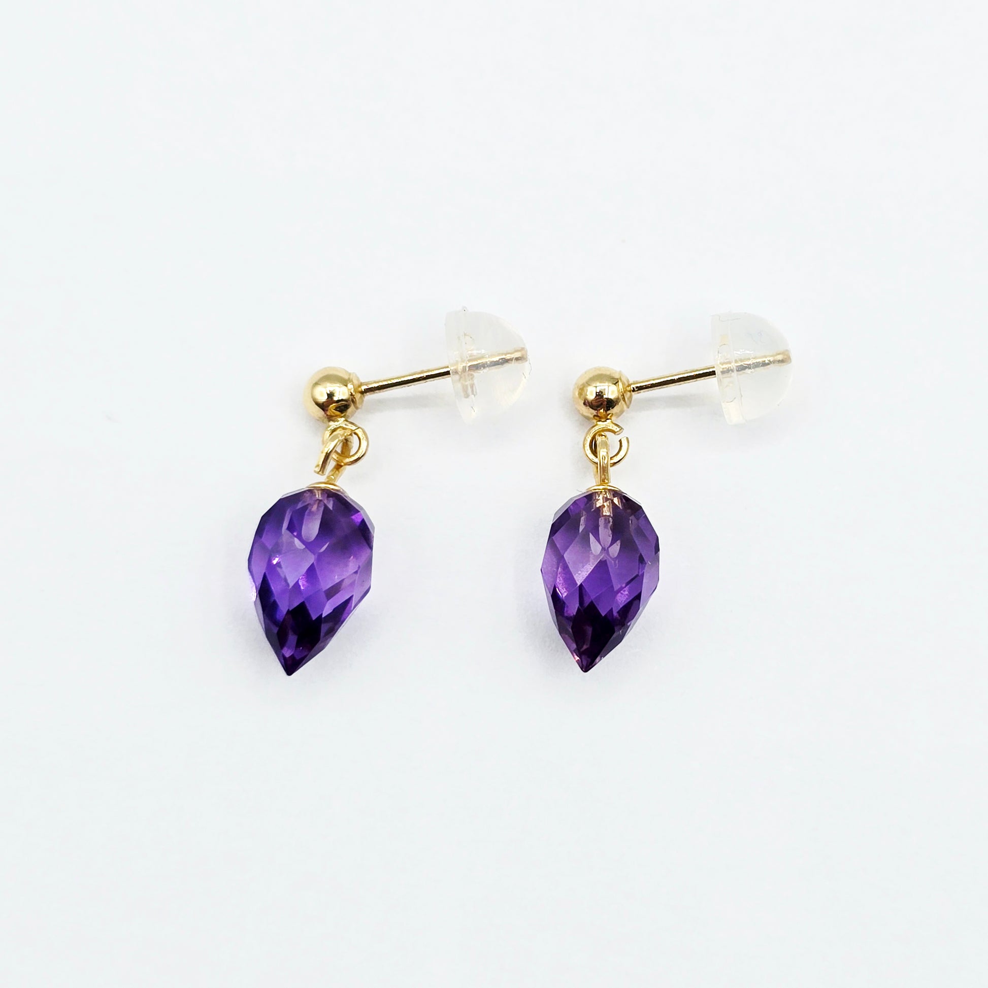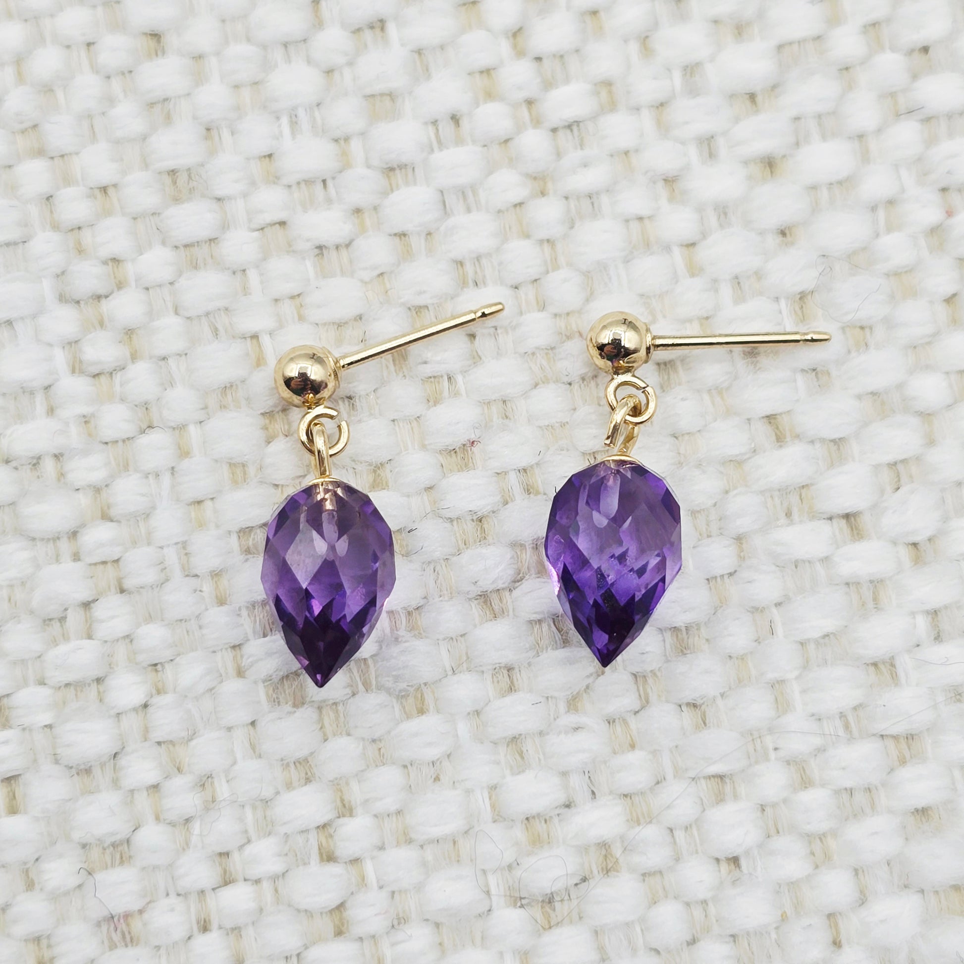 Elegant and timeless, these stunning earrings feature natural pear-shaped amethyst gemstones in a dazzling briolette cut, suspended from classic 14K yellow gold ball studs. The deep purple hue of the amethyst adds a rich pop of colour, while the faceted surface catches the light beautifully with every movement.