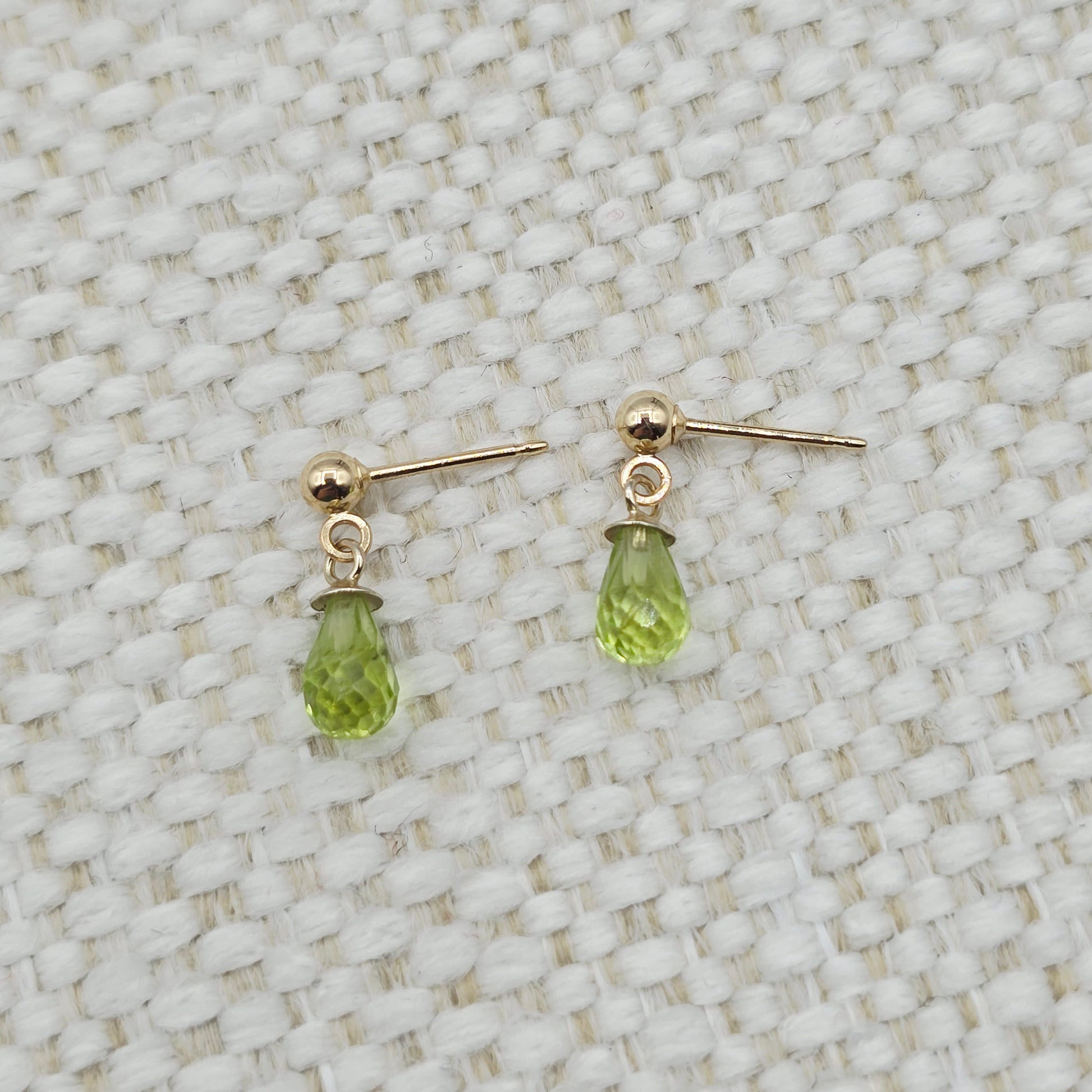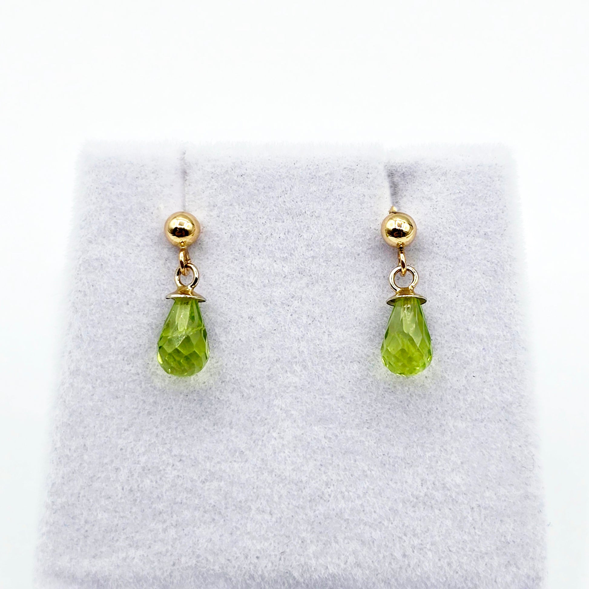 Add a refreshing pop of colour to your jewellery collection with these elegant 14K yellow gold peridot earrings. Featuring natural light green peridot gemstones in a stunning briolette cut, each stone is delicately suspended from classic gold ball studs, creating a graceful dangle effect.