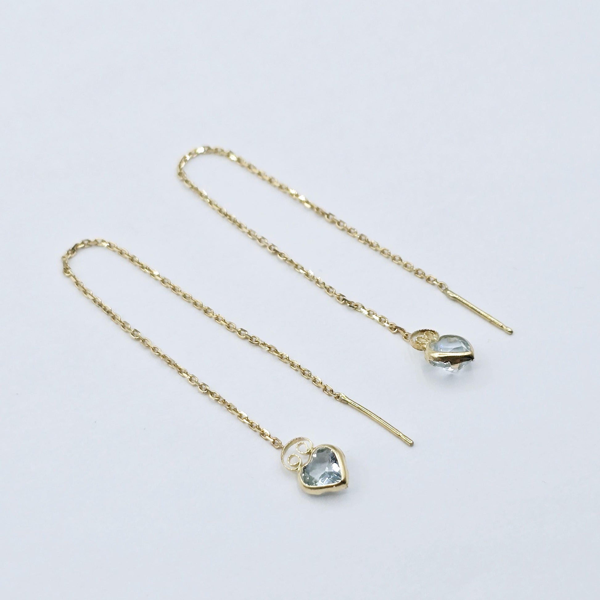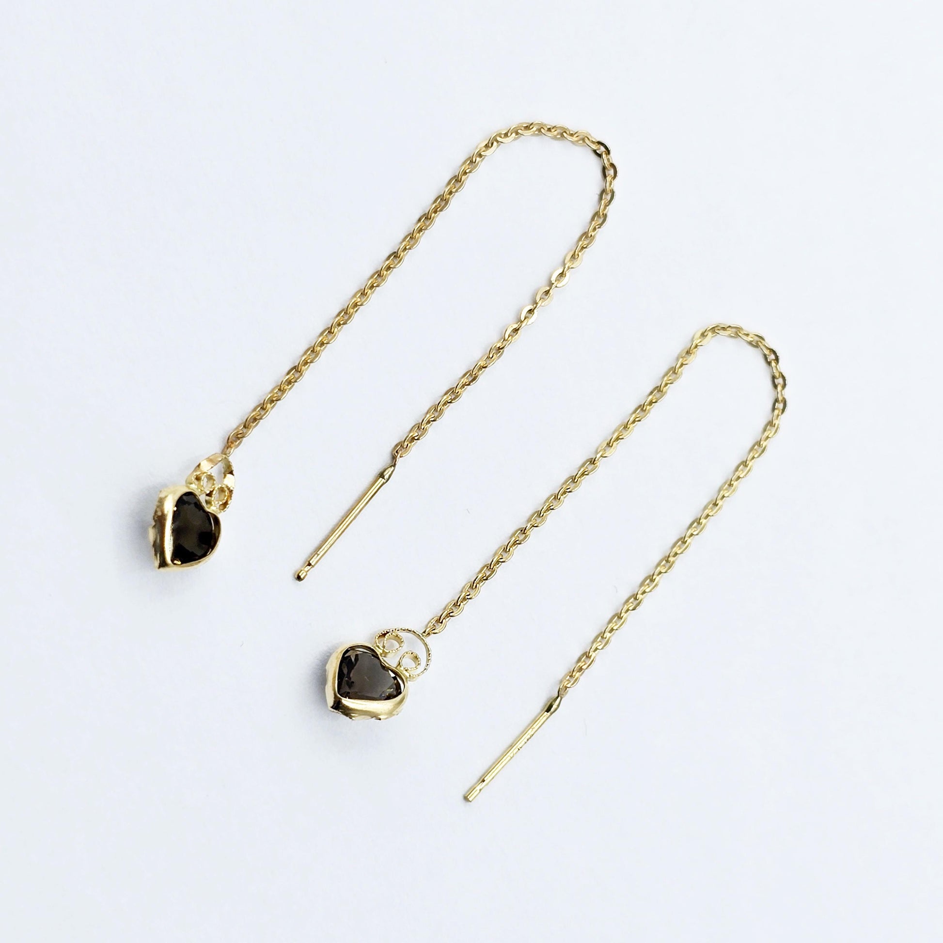 14K Yellow Gold Gemstone Chain Threader Earrings Available in Genuine Aquamarine and Smokey Topaz Size of heart stone: 5mm Handcrafted with care in Canada