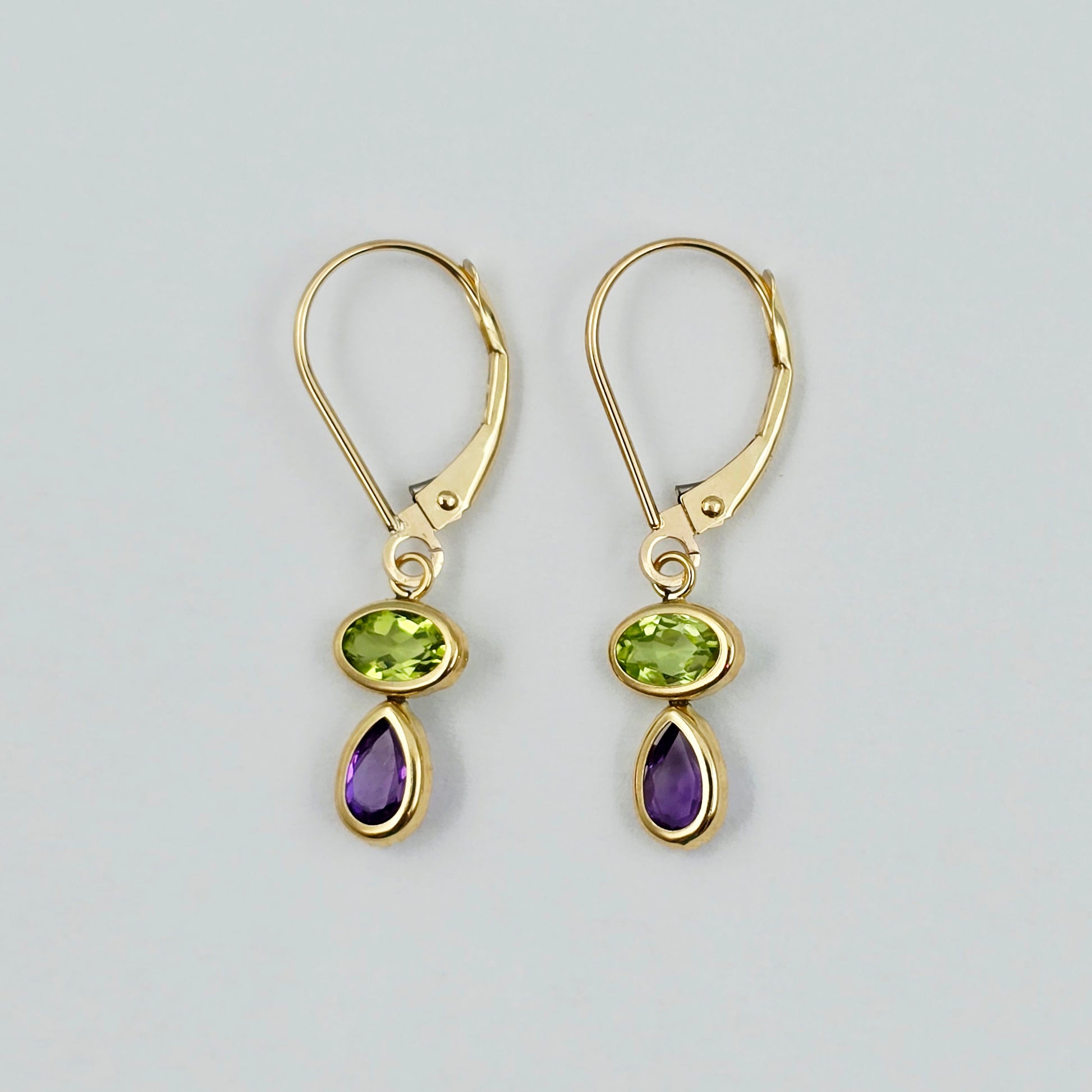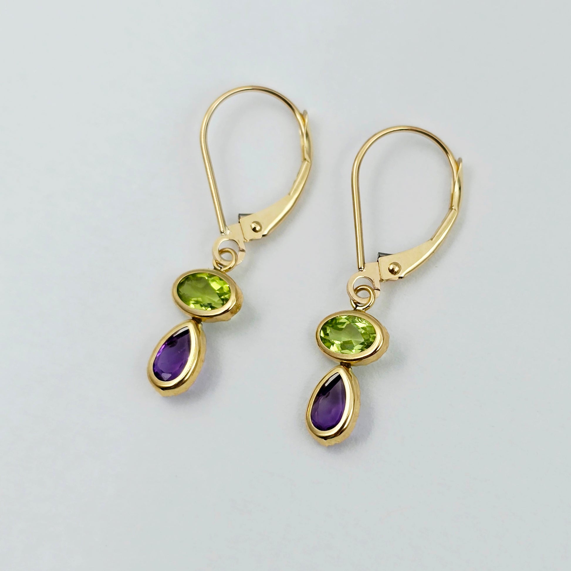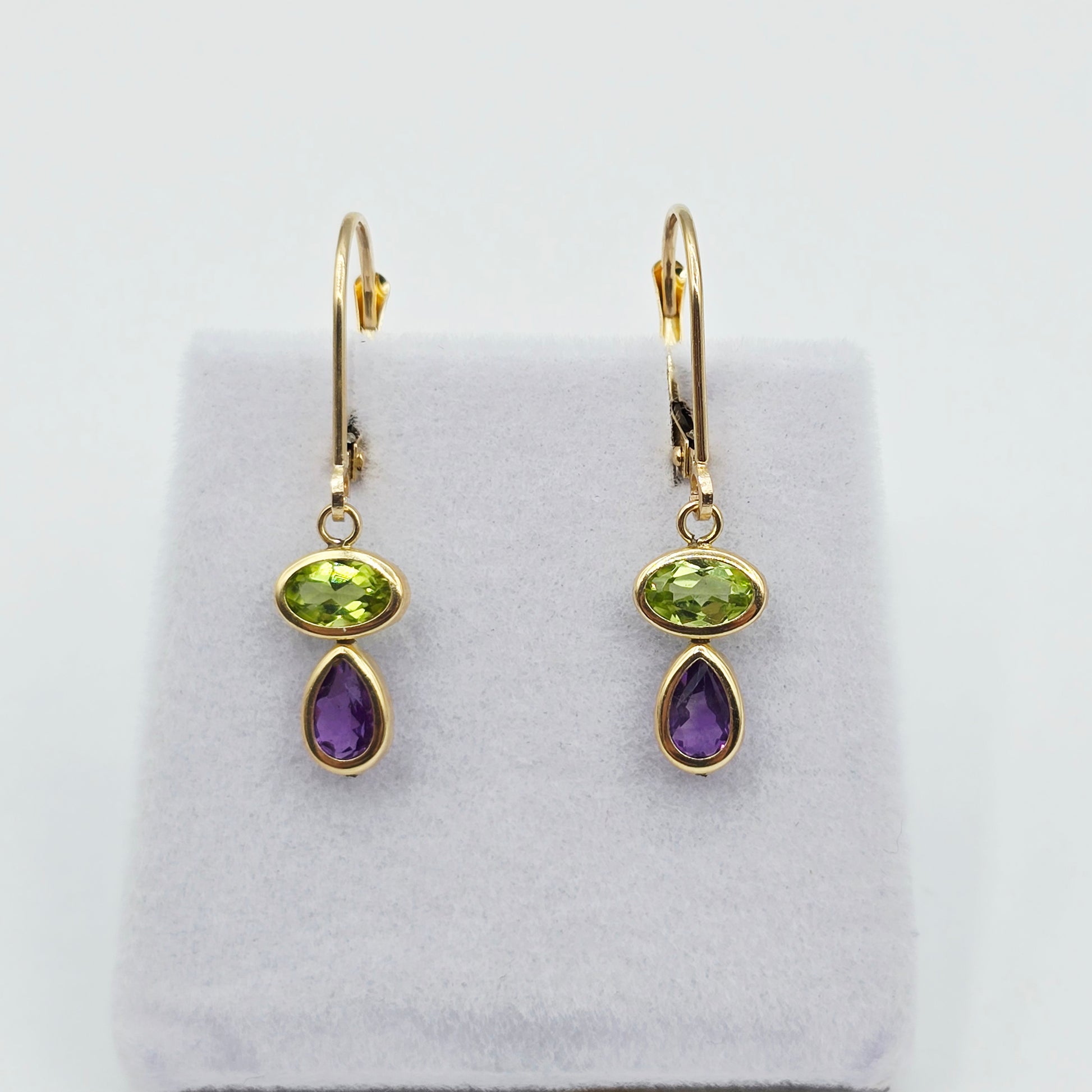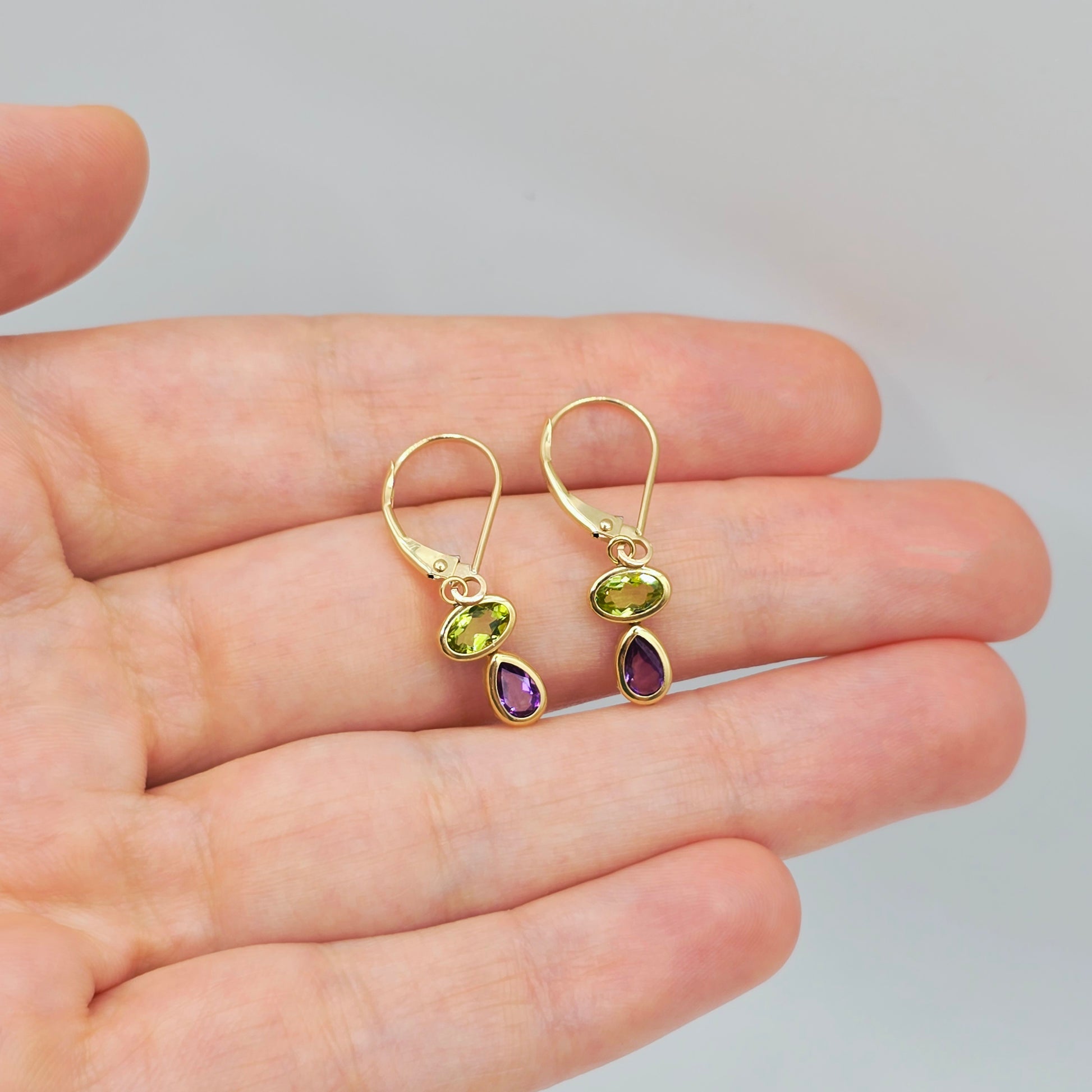 The contrasting colors of peridot and amethyst create a striking yet harmonious combination, perfect for both everyday elegance and special occasions. Lightweight and timeless, these earrings bring a luxurious touch of nature’s beauty to any outfit.