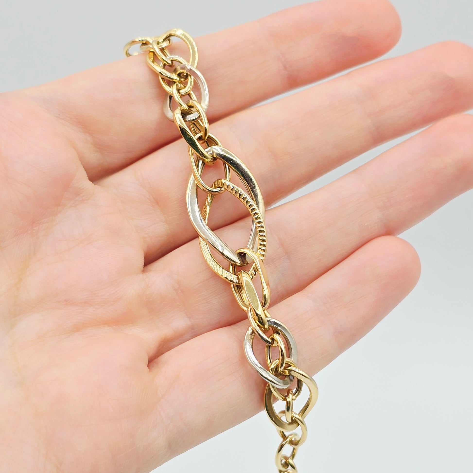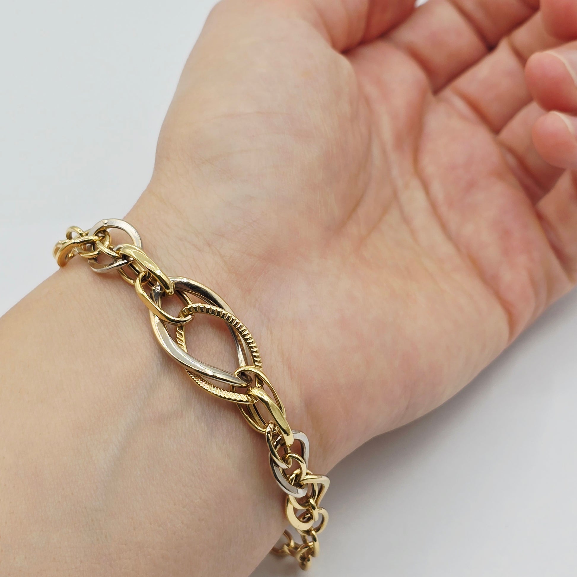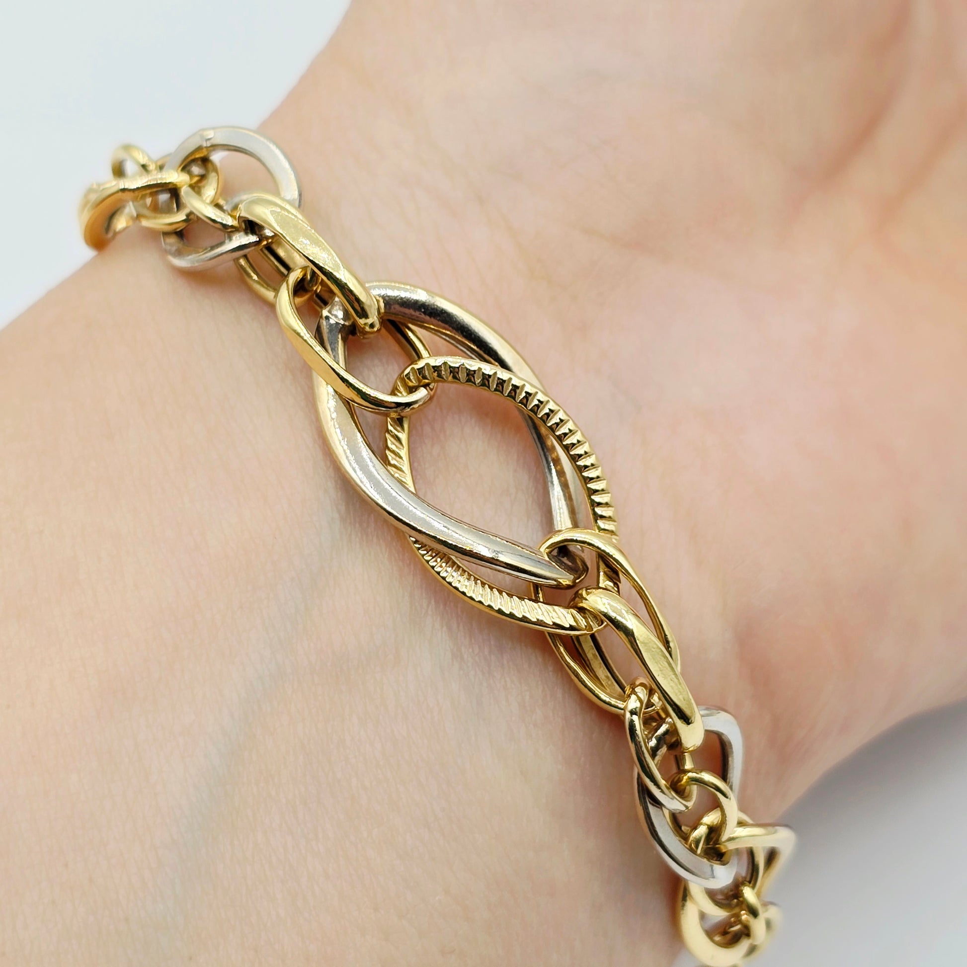 Elevate your style with this luxurious 18K Gold Bracelet, featuring an elegant mix of polished and textured oval links. Crafted in solid 18K yellow and white gold with with a hollow structure timeless shine and durability, this bracelet is perfect for everyday elegance or special occasions. Its classic design with secure spring clasp makes it a versatile piece that complements any jewelry collection. Ideal gift for women who appreciate fine jewelry and sophisticated charm.