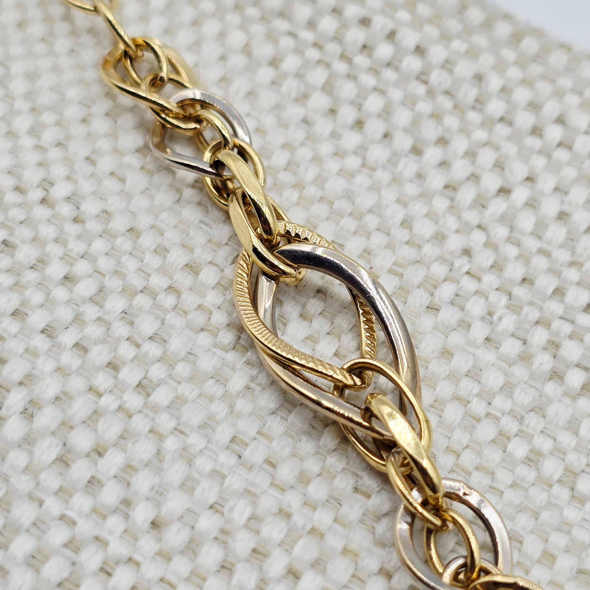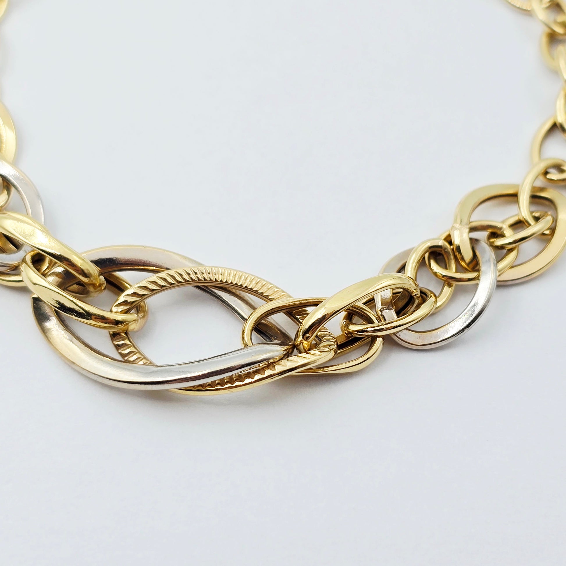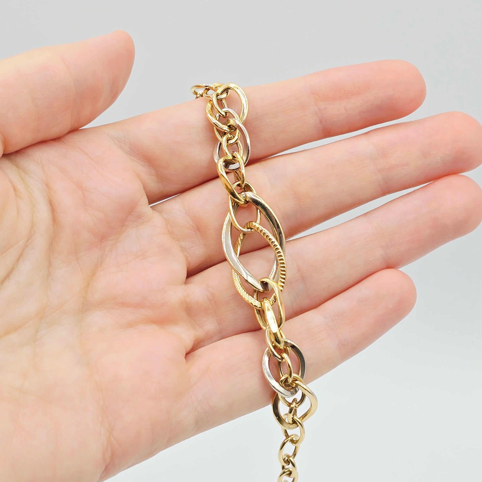 Elevate your style with this luxurious 18K Gold Bracelet, featuring an elegant mix of polished and textured oval links. Crafted in solid 18K yellow and white gold with with a hollow structure timeless shine and durability, this bracelet is perfect for everyday elegance or special occasions. Its classic design with secure spring clasp makes it a versatile piece that complements any jewelry collection. Ideal gift for women who appreciate fine jewelry and sophisticated charm.