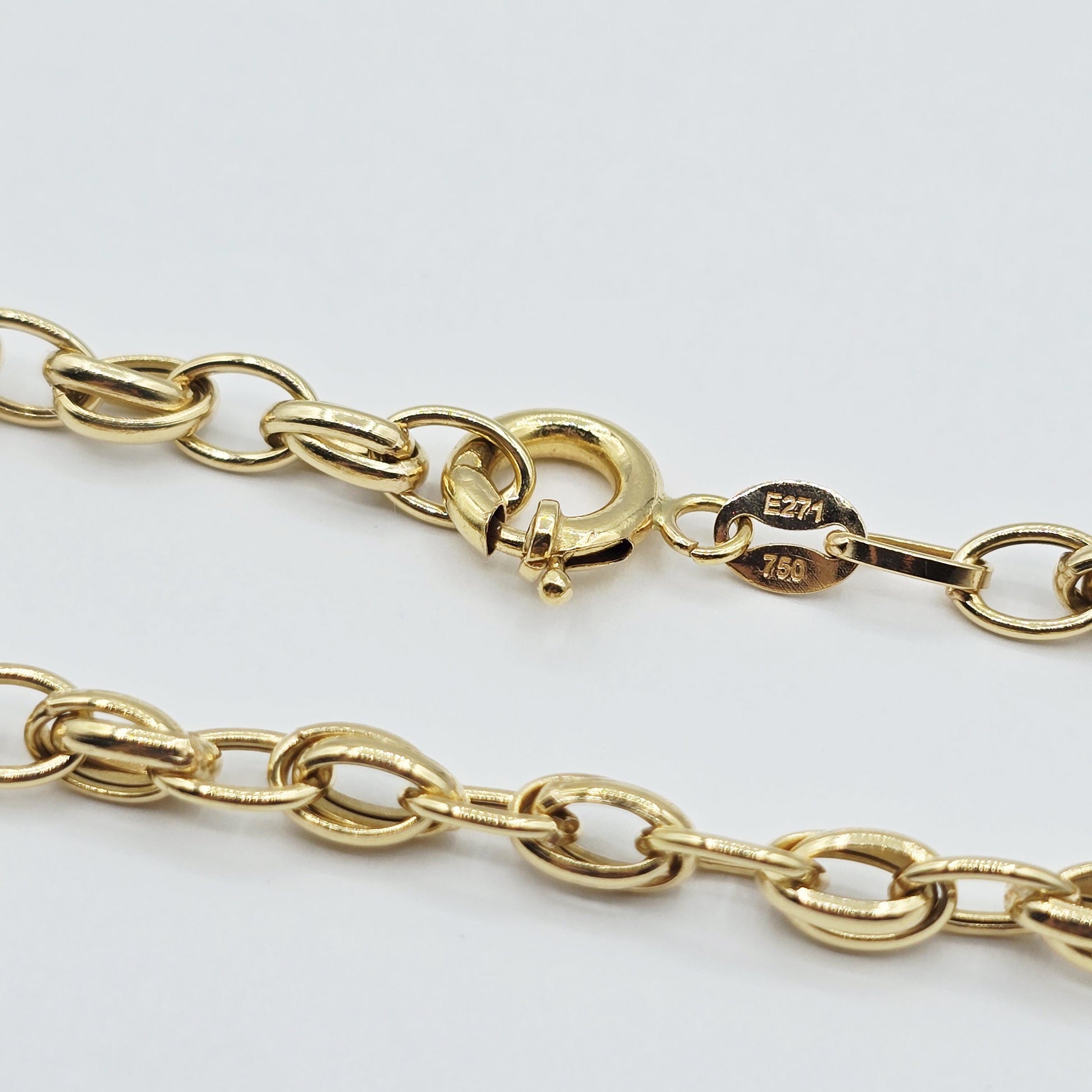 18K Gold Oval Link Chain " This elegant chain is crafted in genuine 18K gold, stamped 750 for authenticity. The design features classic polished oval links that create a bold yet timeless look. It"s made with a hollow design, giving it a lighter feel without compromising its luxurious appearance. Secured with a durable spring ring clasp for everyday comfort and security. This chain is a sophisticated addition to any fine jewelry collection and a thoughtful gift for someone special.