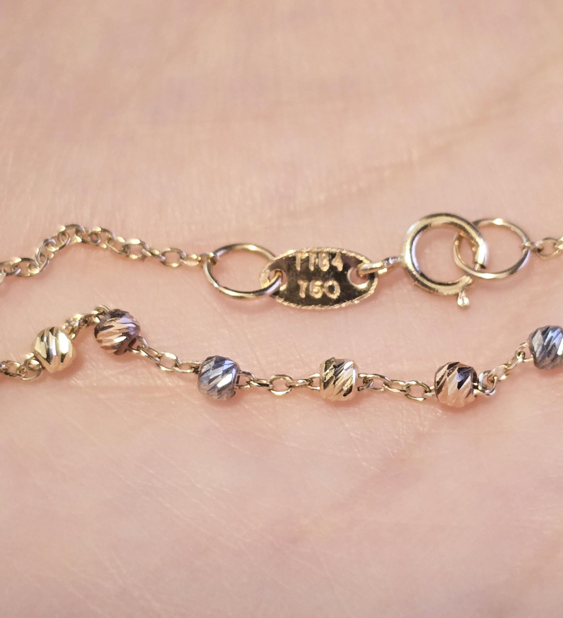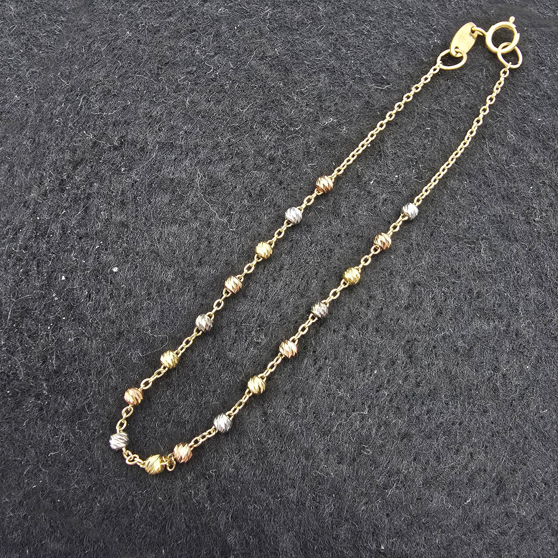 Delicate and elegant 18K Yellow Gold Ball Bracelet, 7.25 inches long. Features a beautiful tri-color design with textured gold beads in yellow, white, and rose gold. A timeless piece perfect for layering or wearing alone