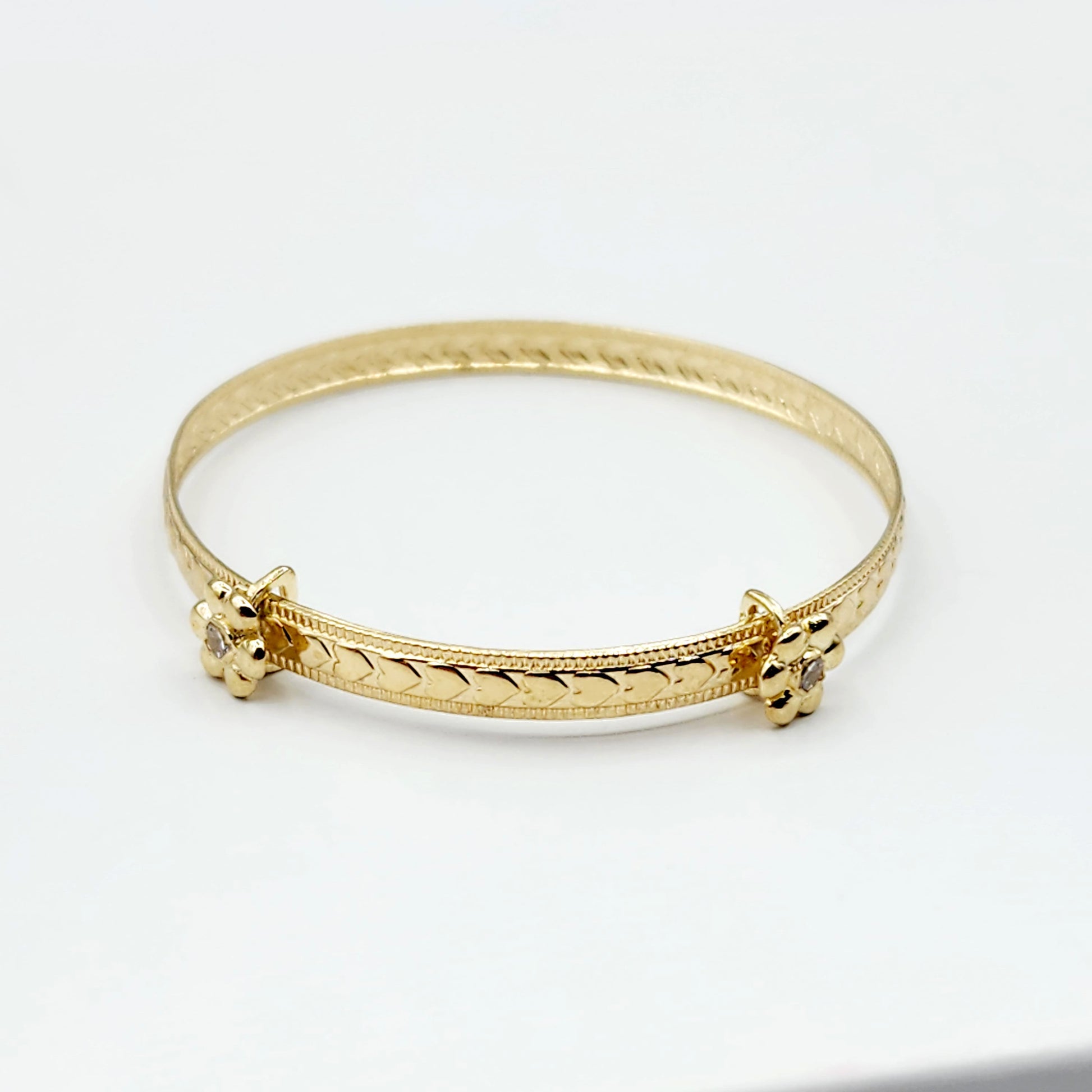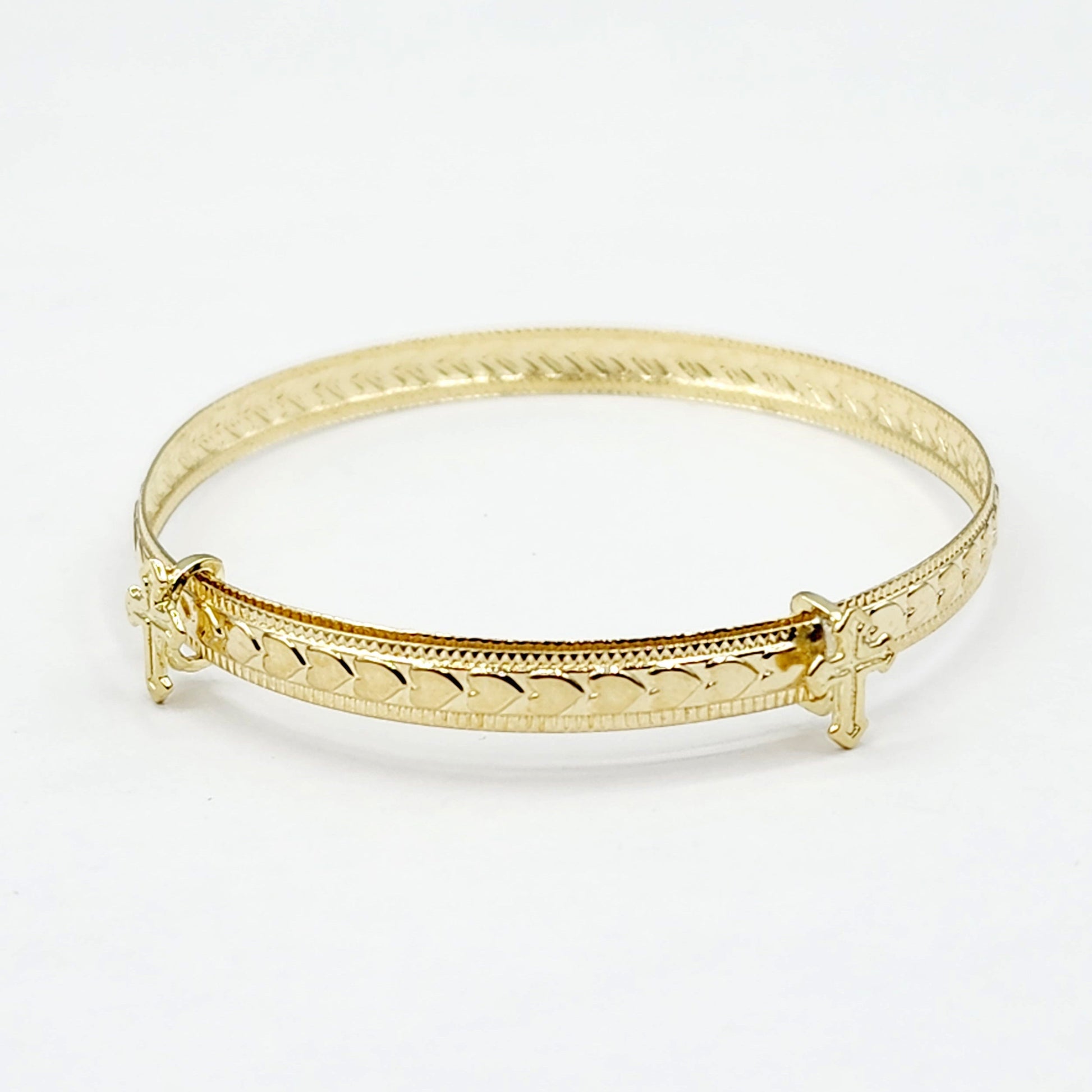 Delight in the timeless elegance of our Gold Bangle for Baby—a precious accessory crafted from 10K solid gold. This adjustable baby bangle is adorned with two charming hearts, flowers and cross charms, adding a touch of sweetness to your little one's attire. A perfect piece of baby jewelry, this gold baby bracelet is not only a symbol of love but also a thoughtful and memorable gift for a precious little one. Celebrate special moments with this exquisite keepsake, designed to be cherished for a lifetime.