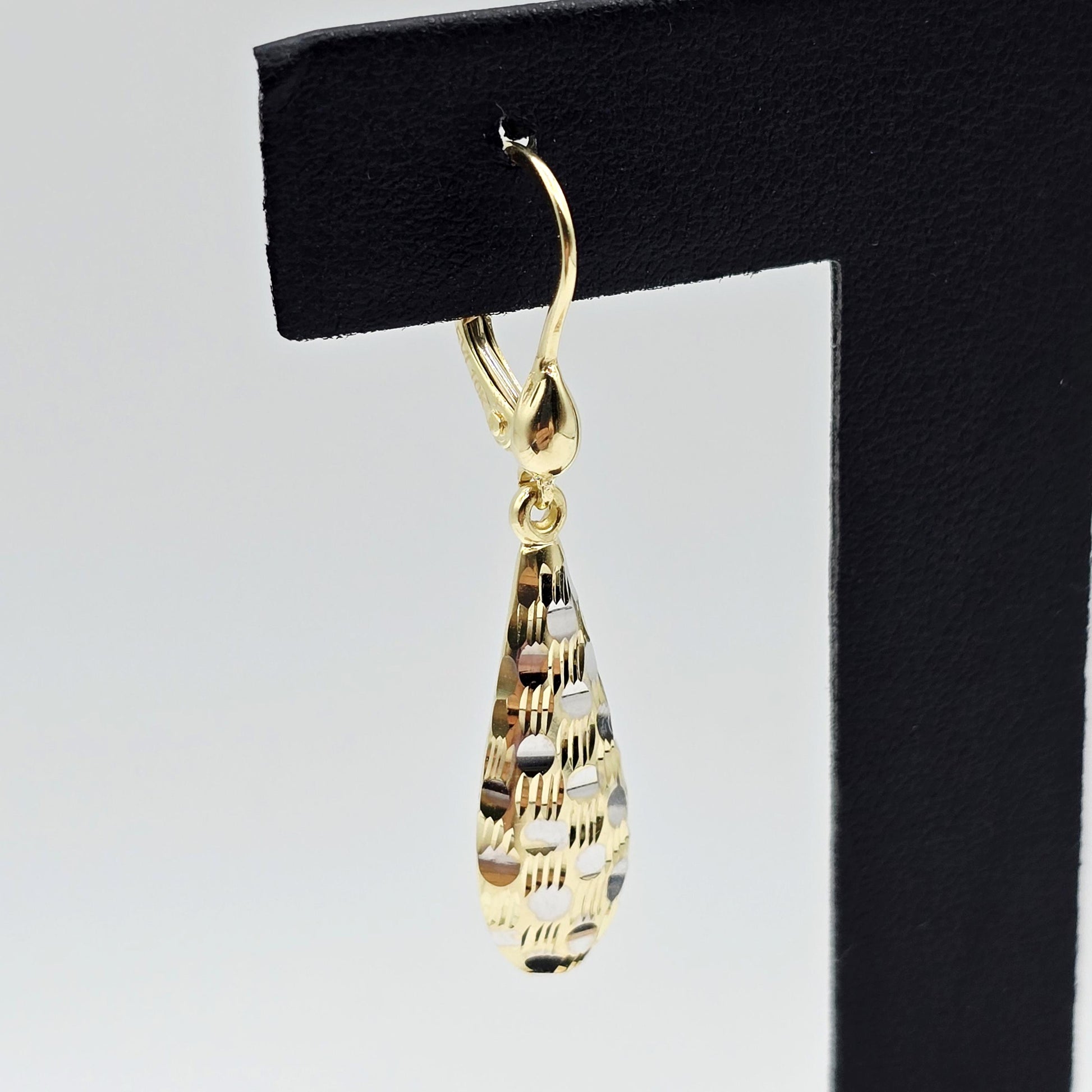 Elegant 10K solid gold drop earrings crafted in a stunning two-tone design of yellow and white gold. Featuring a textured teardrop shape with lever-back closure, these lightweight earrings add timeless shine to any outfit. Perfect for everyday wear or as a meaningful gift.